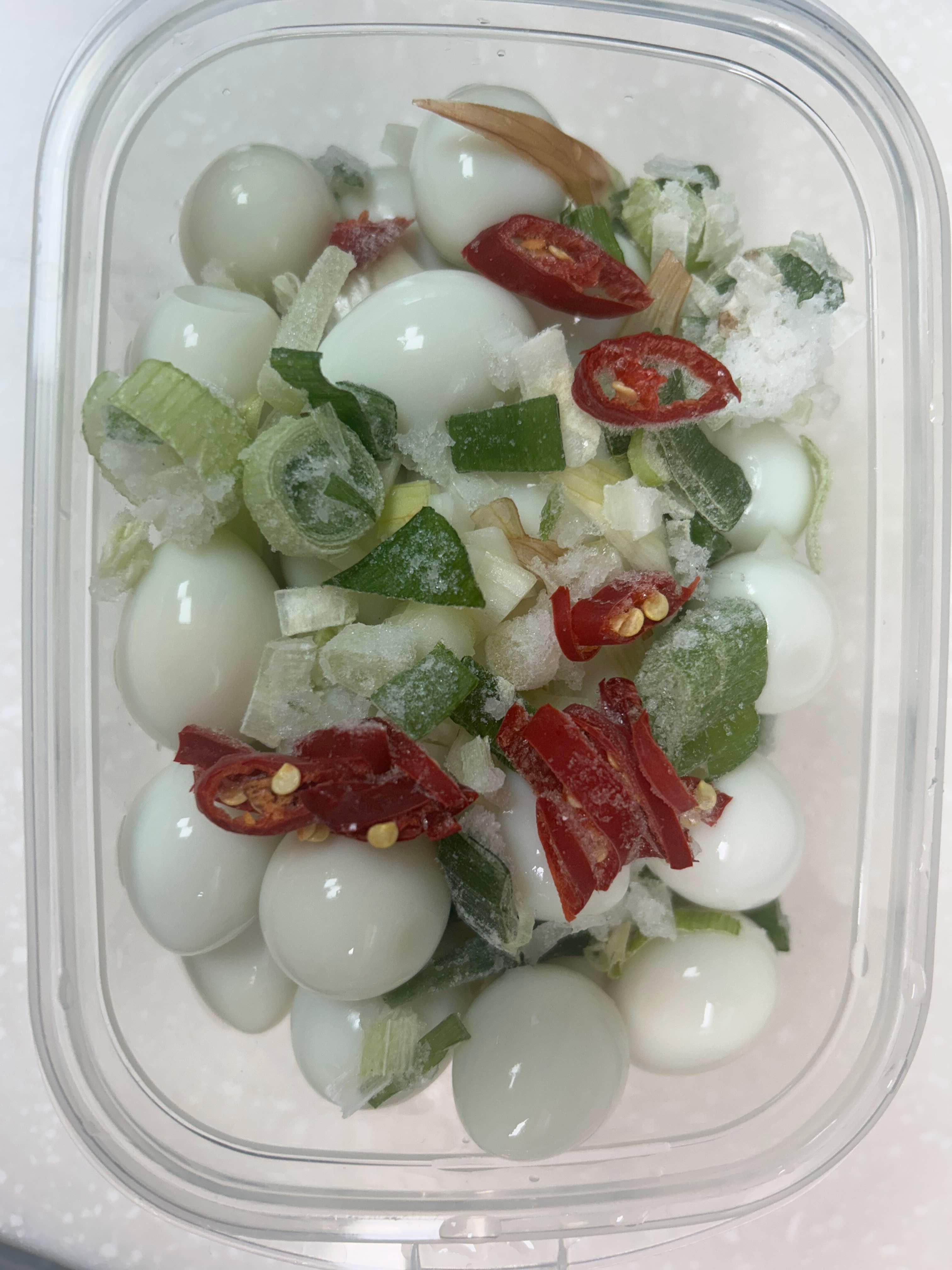 1. 준비한 메추리알을 밀폐 용기에 담고, 양파, 홍고추, 대파를 올려주세요.
