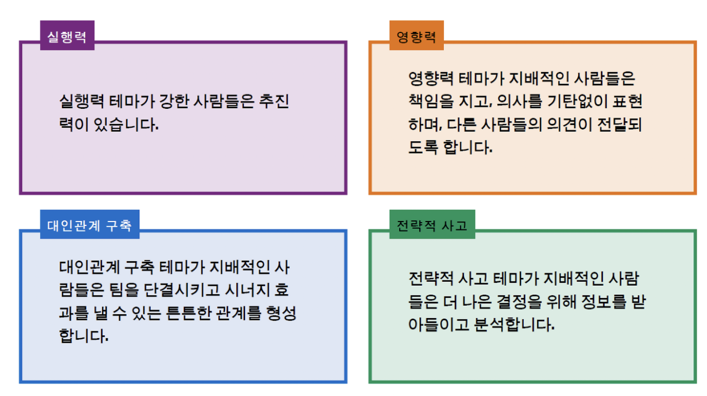 저는 top 5에 실행력 1개, 대인관계 구축 3개, 전략적 사고가 1개 나왔습니다.