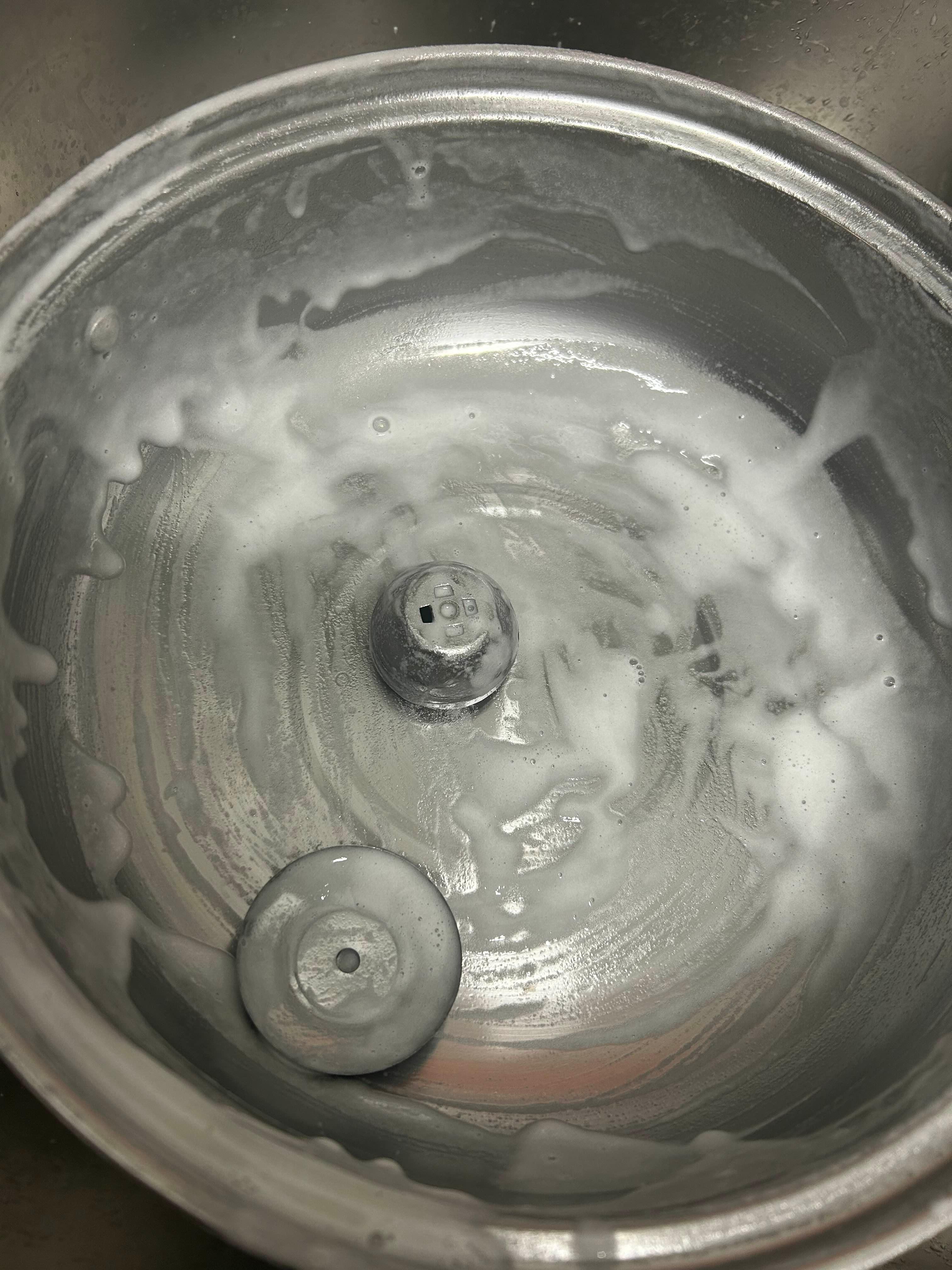 스펀지에 혼합물을 묻혀 제품 표면을 부드럽게 문질러 닦아주세요. 특히 연마제가 남아 있을 가능성이 높은 스테인리스 바닥이나 모서리 부분은 꼼꼼히 닦아주는 것이 중요합니다. 제 냄비는 냄비 바깥에 연마제가 새까맣게 나오더라구요